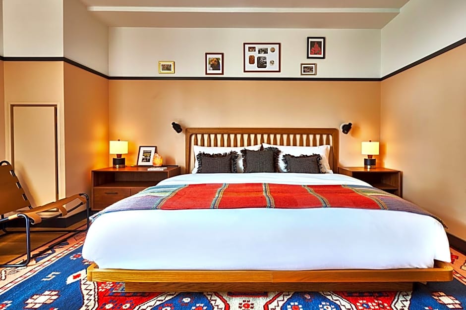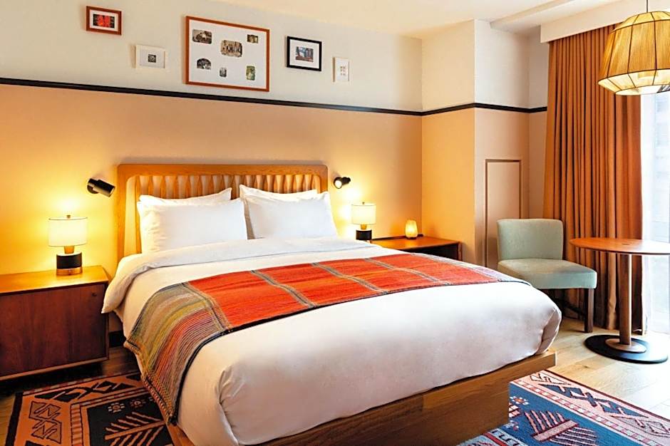 This room features hardwood floors, a floor-to-ceiling window with views of the city, a sitting area with a sofa, custom millwork with built-in desk, vinyl record player and Bluetooth speakers. The private bathroom has a tiled walk-in shower and Grown Alchemist 100% natural, free-of-harmful-chemicals products.
